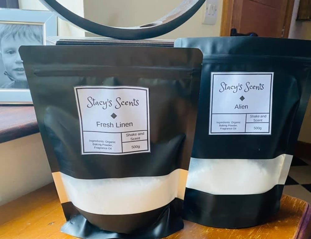 A 500g refill bag of highly scented shake n scent powder. This can be used to freshen carpets, beds or even bins!